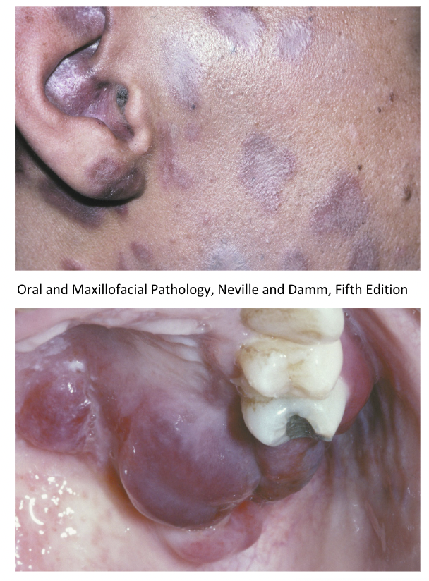 Multiple, Blue / purple macules, plaques and nodules on face and oral mucosa