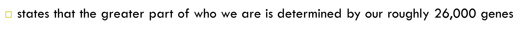 ¨states that the greater part of who we are is determined by our roughly 26,000 genes
