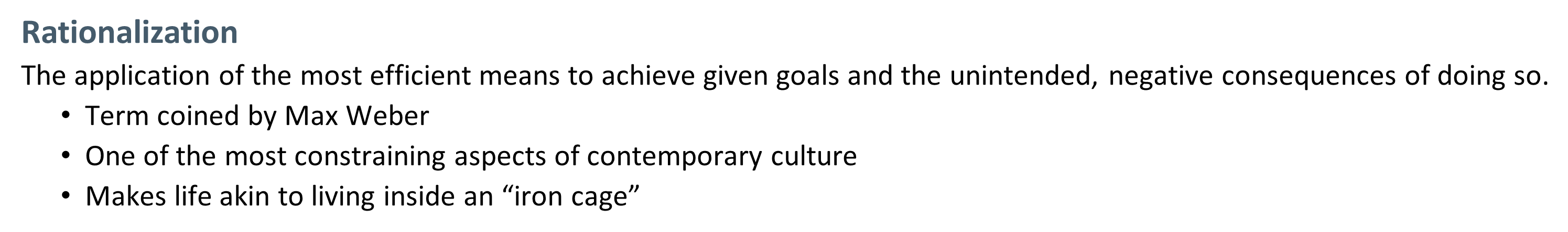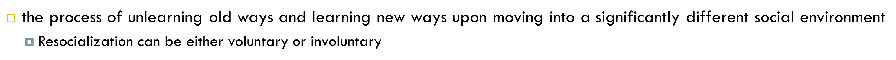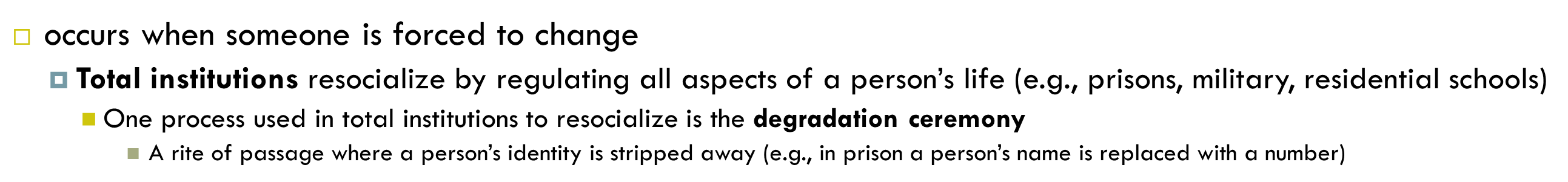 ¤Total institutions resocialize by regulating all aspects of a person’s life (e.g., prisons, military, residential schools)