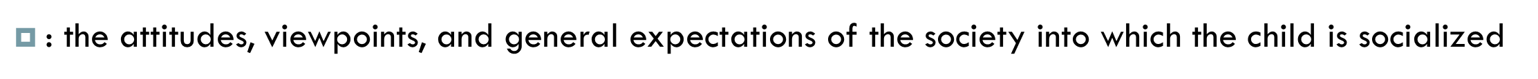 ¤: the attitudes, viewpoints, and general expectations of the society into which the child is socialized