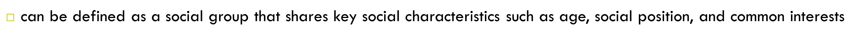 ¨can be defined as a social group that shares key social characteristics such as age, social position, and common interests