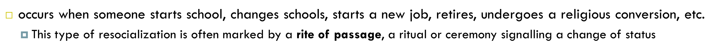 ¤This type of resocialization is often marked by a rite of passage, a ritual or ceremony signalling a change of status