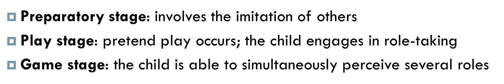 ¤Play stage: pretend play occurs; the child engages in role-taking