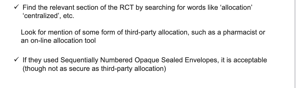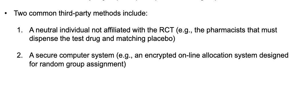 It’s when the hospital pharmacy (not the researchers) is in charge of giving out the treatment or placebo, which keeps the group assignments hidden from investigators.