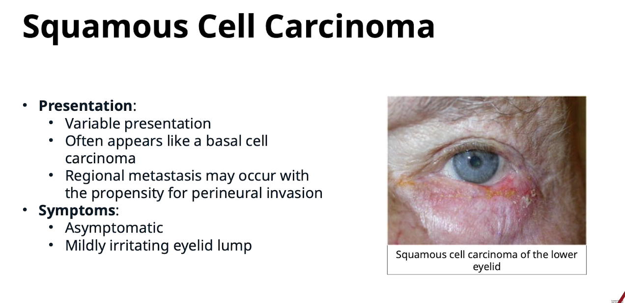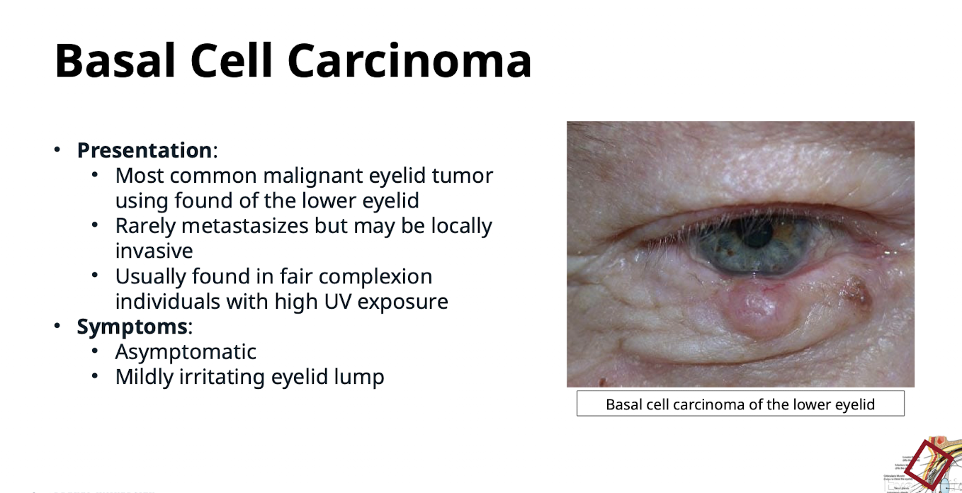 Regional metastasis may occur with the propensity for perineural invasion. Usually asymptomatic or a mildly irritating eyelid lump