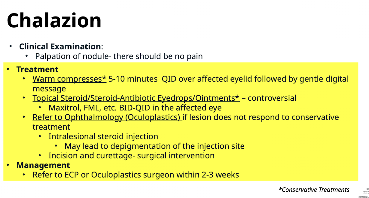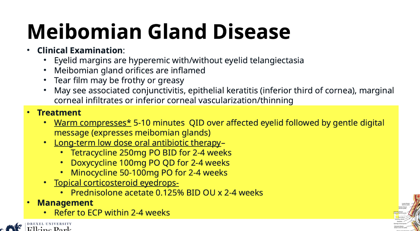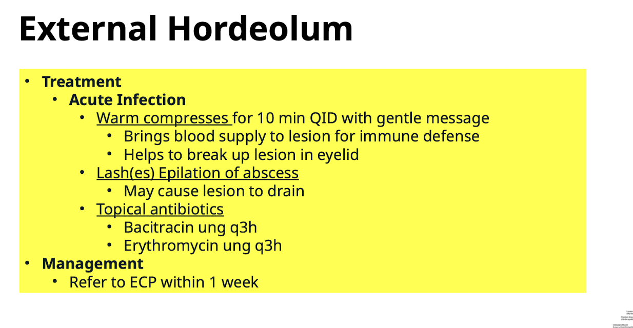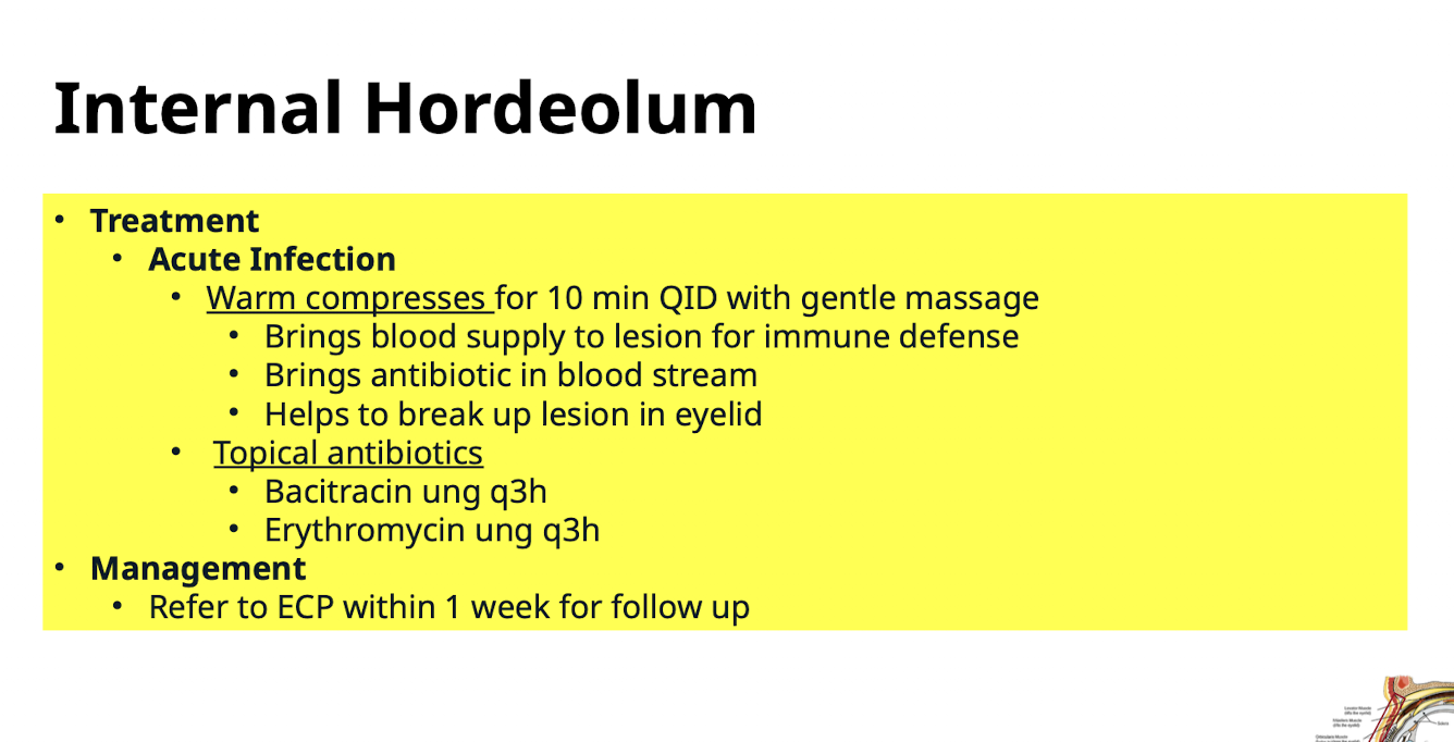 Warm compresses* 5-10 minutes QID over affected eyelid followed by gentle digital massage (expresses meibomian glands)
