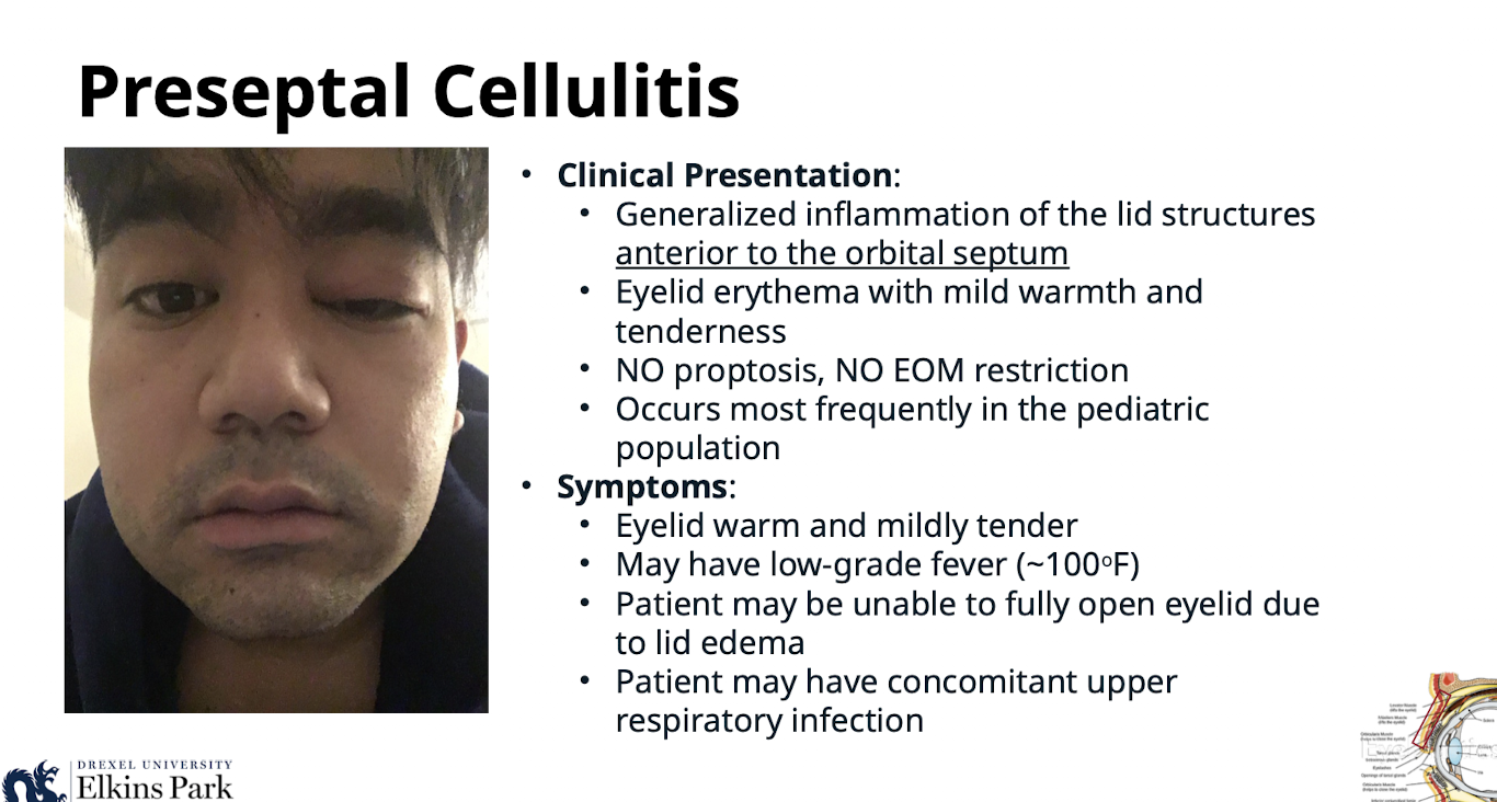 What is the clinical presentation of Preseptal Cellulitis?