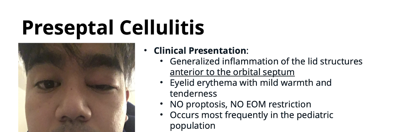 Generalized inflammation of the lid structures anterior to the orbital septum; eyelid erythema with mild warmth and tenderness; NO proptosis; NO EOM restriction