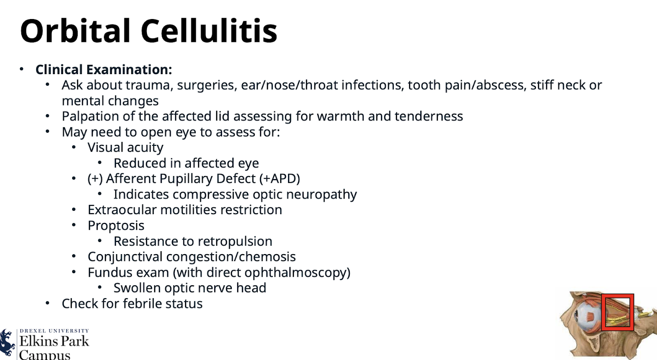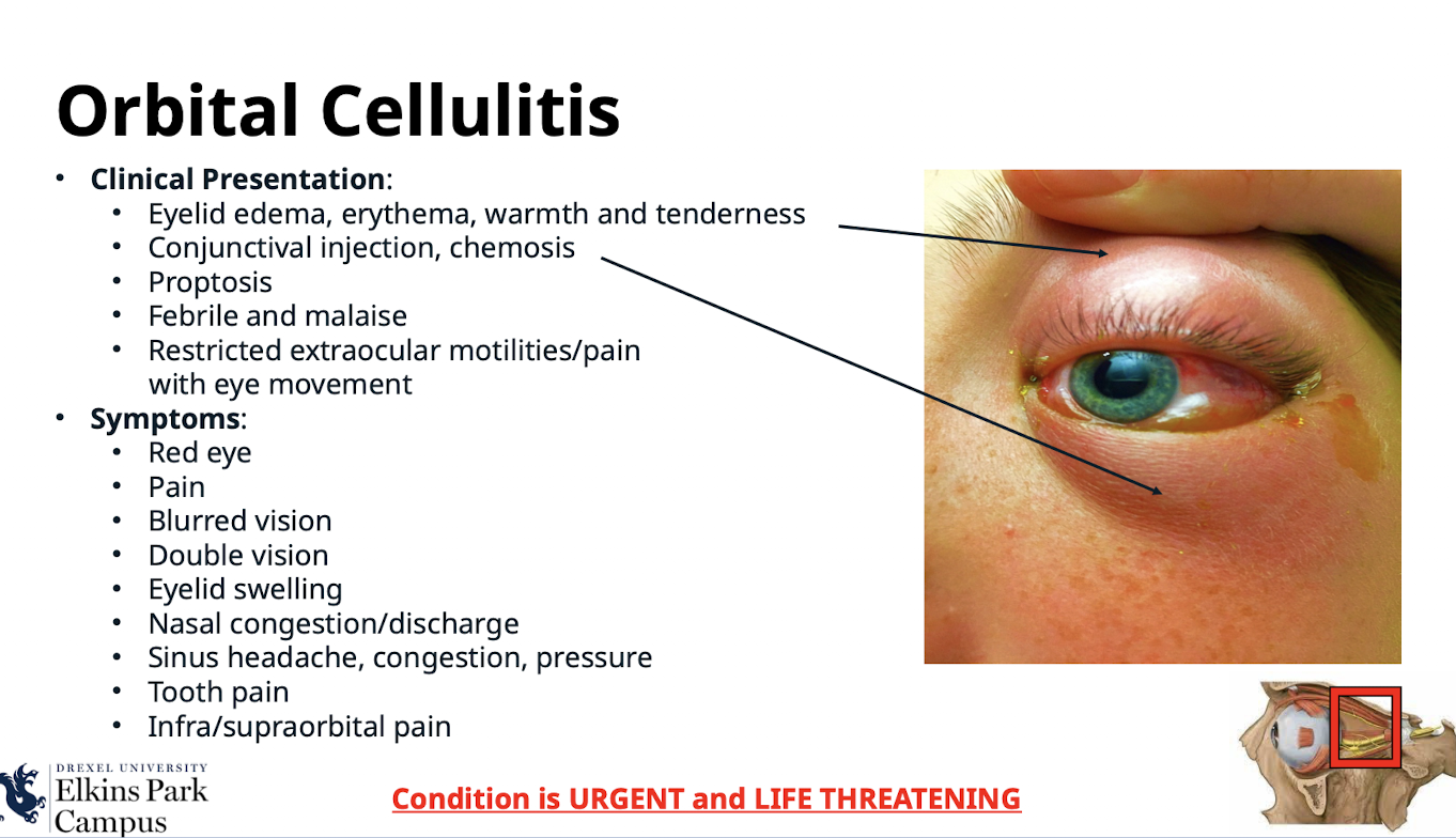 Eyelid edema; erythema; warmth and tenderness; Conjunctival injection; chemosis (ballooning of the conjunctiva, differentiates from preseptal cellulitis); Proptosis; Febrile and malaise; Restricted extraocular motilities/pain with eye movement