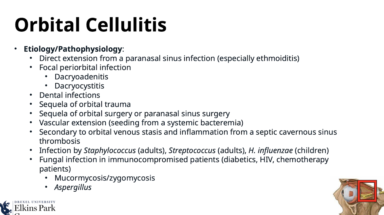 Sequela of orbital trauma; Sequela of orbital surgery or paranasal sinus surgery; Vascular extension (seeding from a systemic bacteremia); Secondary to orbital venous stasis and inflammation from a septic cavernous sinus thrombosis