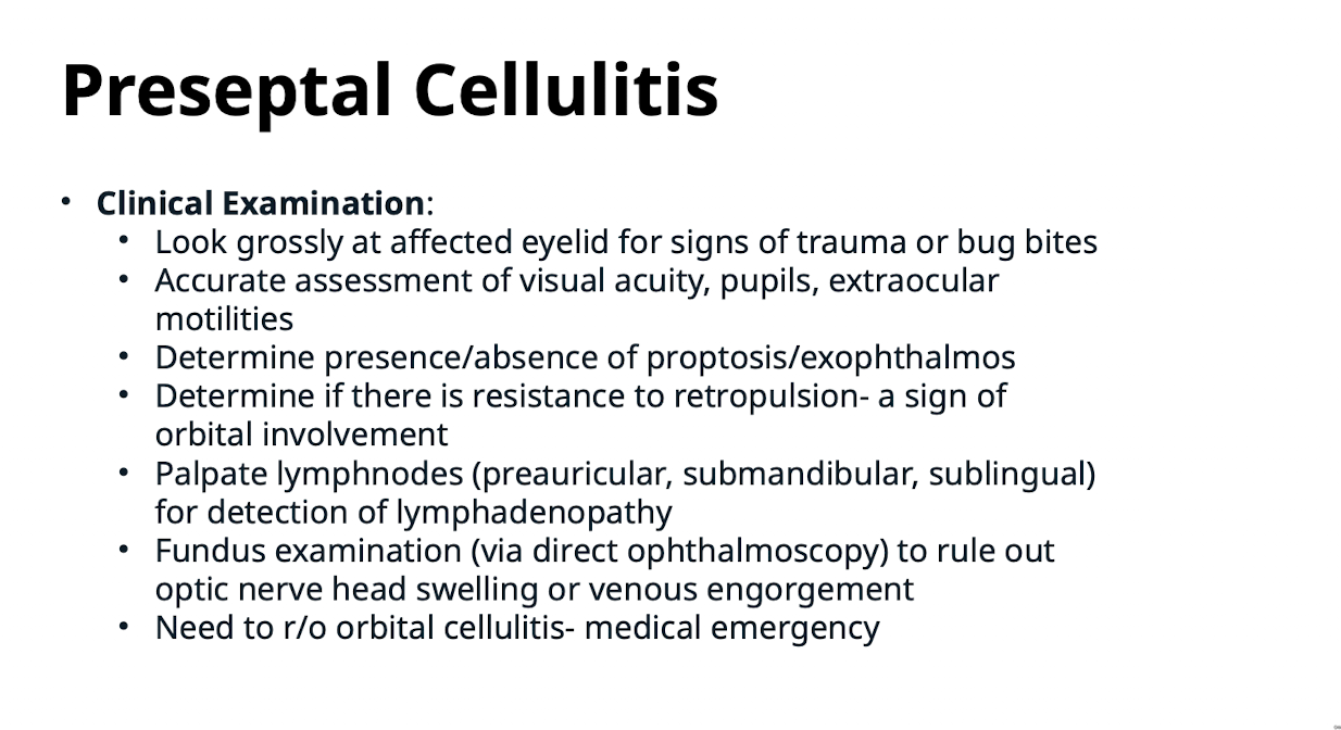 What must be assessed accurately during the clinical examination for Preseptal Cellulitis?