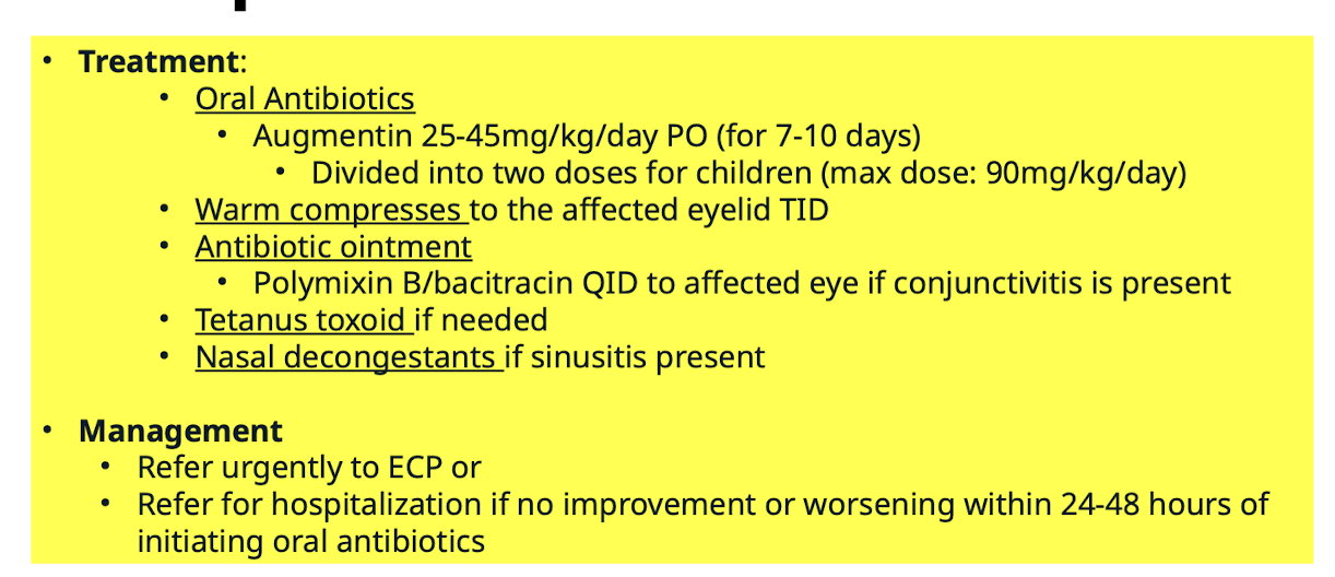 Warm compresses to the affected eyelid TID; antibiotic ointment (Polymixin B/bacitracin QID to affected eye if conjunctivitis is present); Tetanus toxoid if needed; Nasal decongestants if sinusitis present