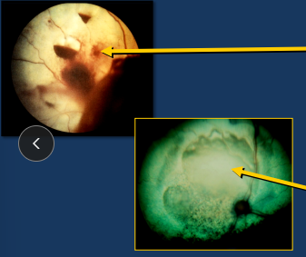 Cs: CKD, recurrent fever, tibotarsal swollen joints(shar pei), liver rupture, hemoabdomen, poor coat, small odd kidneys, nephrotic syndrome, thromboembolism, retinal hemorrhage/detachment - sudden blindness (Ab. cats)