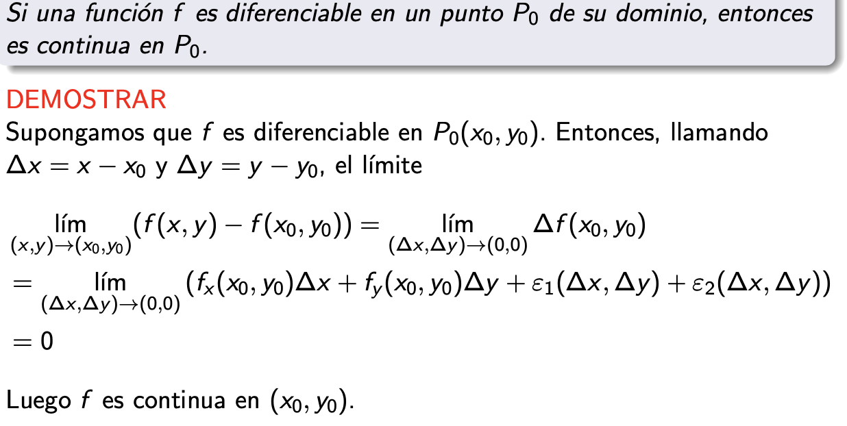 Sustituimos nuevamente y llegamos a la definición de función diferenciable. Nos queda probar que los errores tienden a cero cuando (∆x, ∆y) → (0, 0). Aplicamos la continuidad de las derivadas parciales que tenemos por hipótesis y aseguramos que