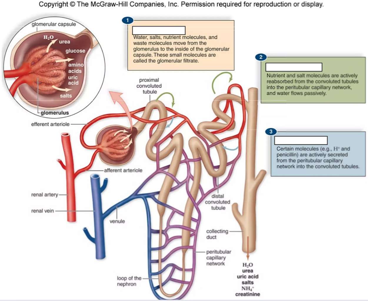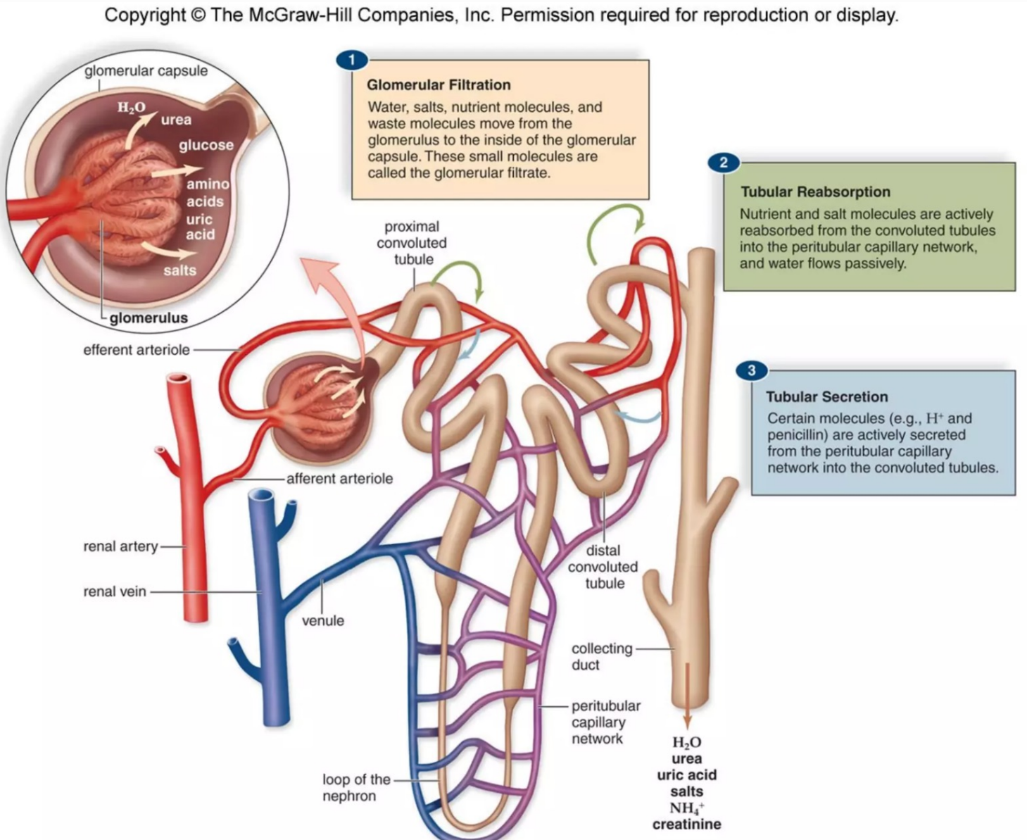 Removes ammonia, uric acid, hydrogen ions, creatinine and penicillin which are secreted into convoluted tubules