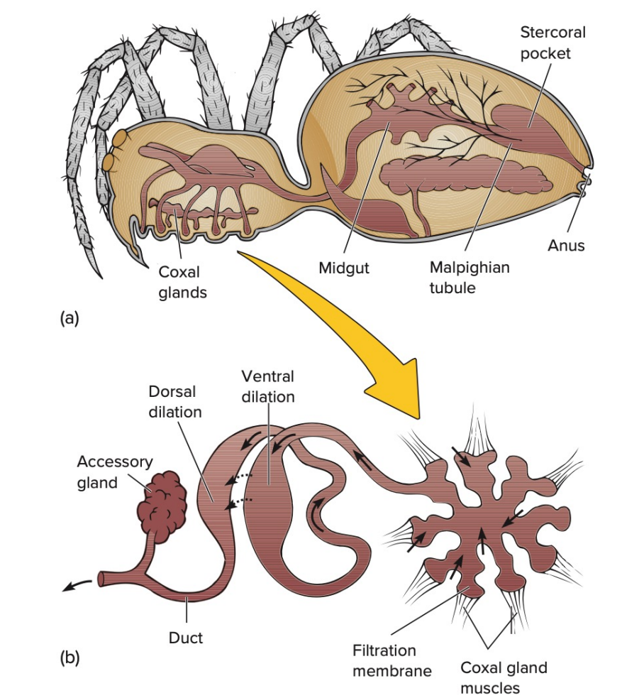 Wastes are discharged through pores on one to several pairs of appendages near the proximal segment (coxa) of the leg