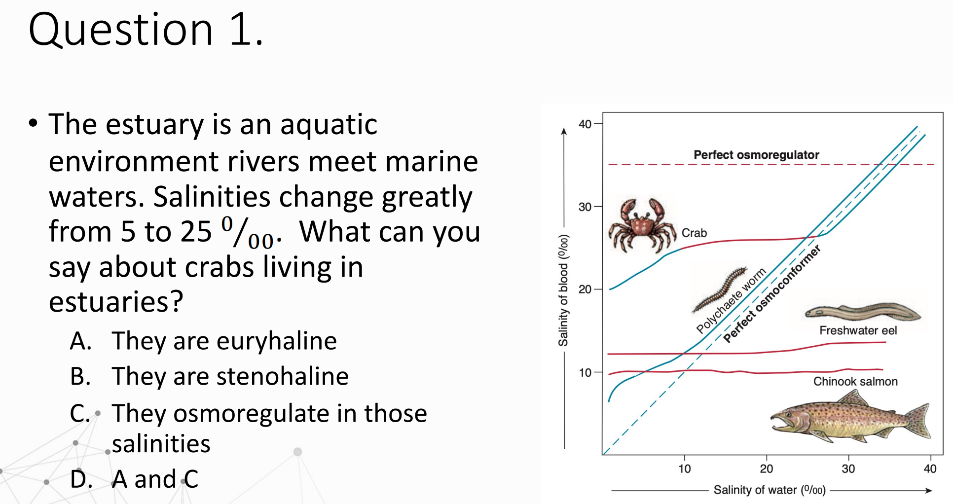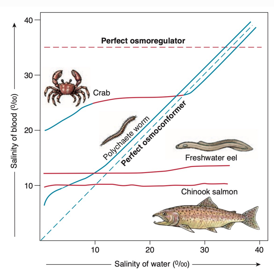 From the graph, the crab keeps its internal (blood) salinity relatively constant even as the external water salinity changes → this means it osmoregulates.
