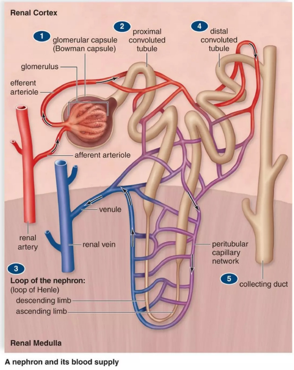 Surrounded by a network of blood vessels that assist in reabsorption of water and valuable materials such as salts, sugars, and amino acids