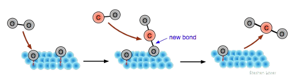 When A adsorbs, then leaves with a surface atom (eg. Oxygen). B replaces the surface atom.