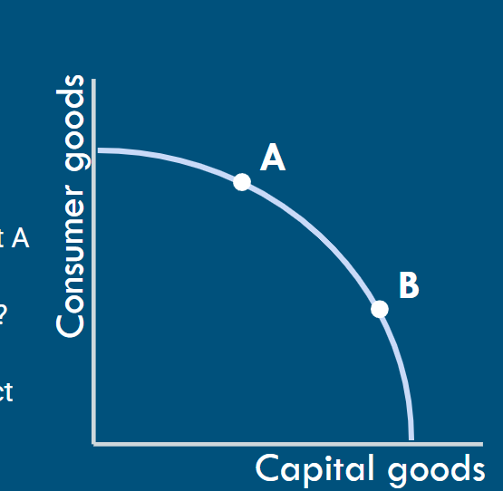 shows the combination of two goods that could be produced by an economy if all of its resources are employed fully and efficiently. It shows the productive potential of an economy