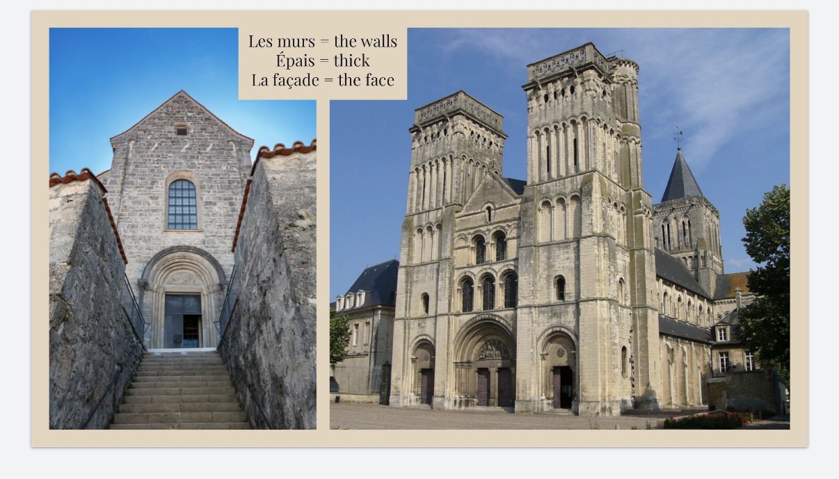 Bonjour. Aujourd’hui, je vais présenter les cathédrales romanes, un style d’architecture du Moyen Âge. Ce style apparaît en Europe entre le dixième et le douzième siècle. Les cathédrales romanes, par exemple ici: la Sainte-Foy à Conques à Conques, France, sont solides, simples, et très importantes pour les communautés chrétiennes.