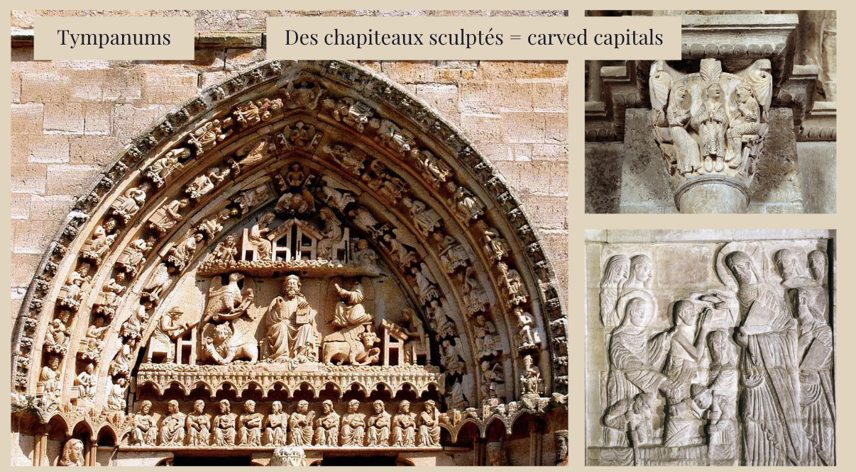 On trouve des chapiteaux sculptés, des tympanums, et des scènes religieuses en pierre.