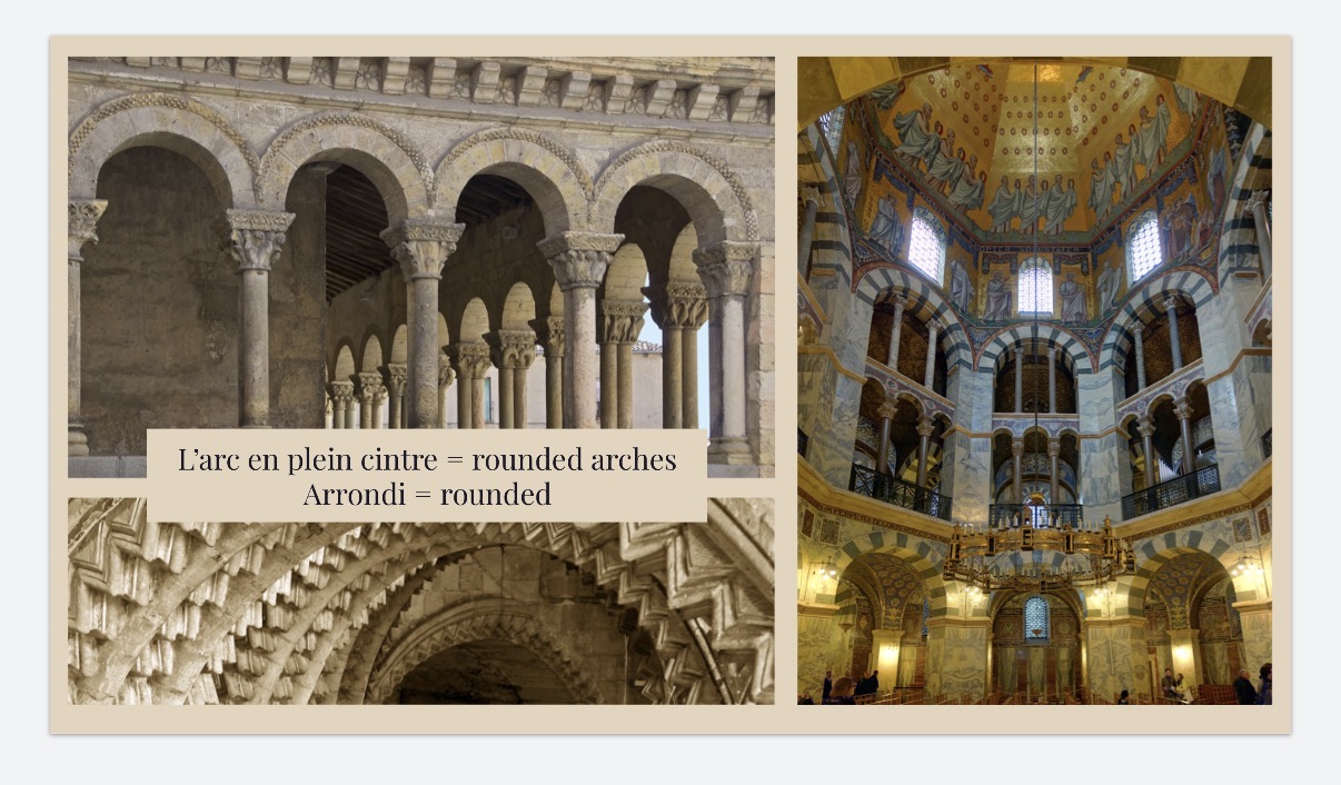 L’élément le plus important du style roman est l’arc en plein cintre. C’est un arc arrondi, simple et solide. Cet arc vient de l’architecture romaine antique, et il donne son nom au style roman. Ils se trouvent à l'intérieur et à l'extérieur. Les arcs supportent le poids (weight) du bâtiment.