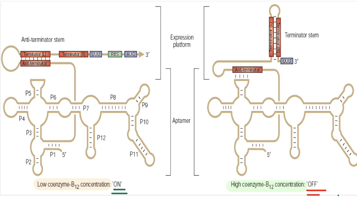 Low B12: Anti-terminator forms → sequence binds to left side of terminator sequence → terminator doesn’t form → transcription continues of biosynthesis genes