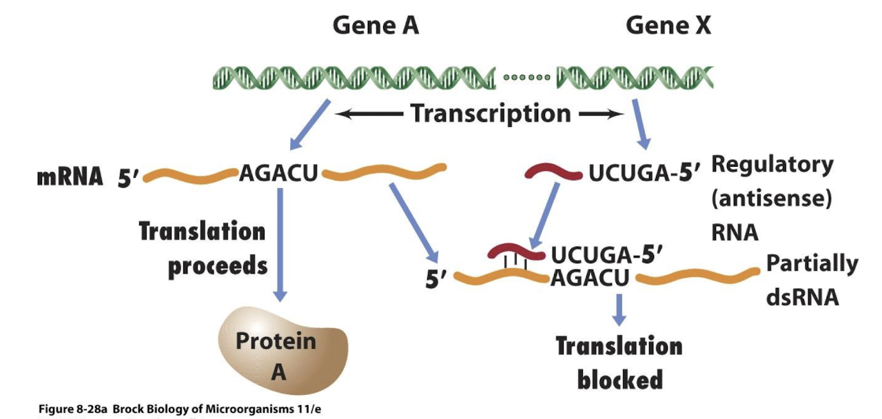 Short non-coding RNAs that bind complementary sequences on mRNAs to block the ribosome binding site, inhibiting translation