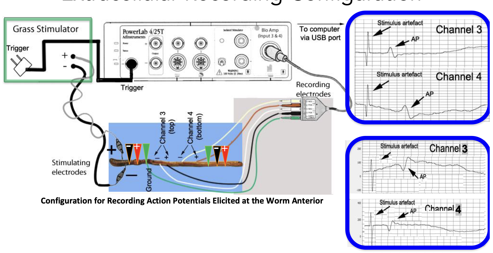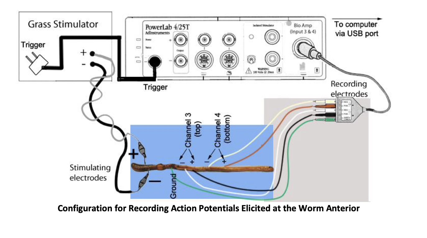 Electrical stimulation of the earthworm ventral nerve cord using two pairs of stainless-steel pin electrodes placed near the nerve, recording the potential difference between the two points on the nerve