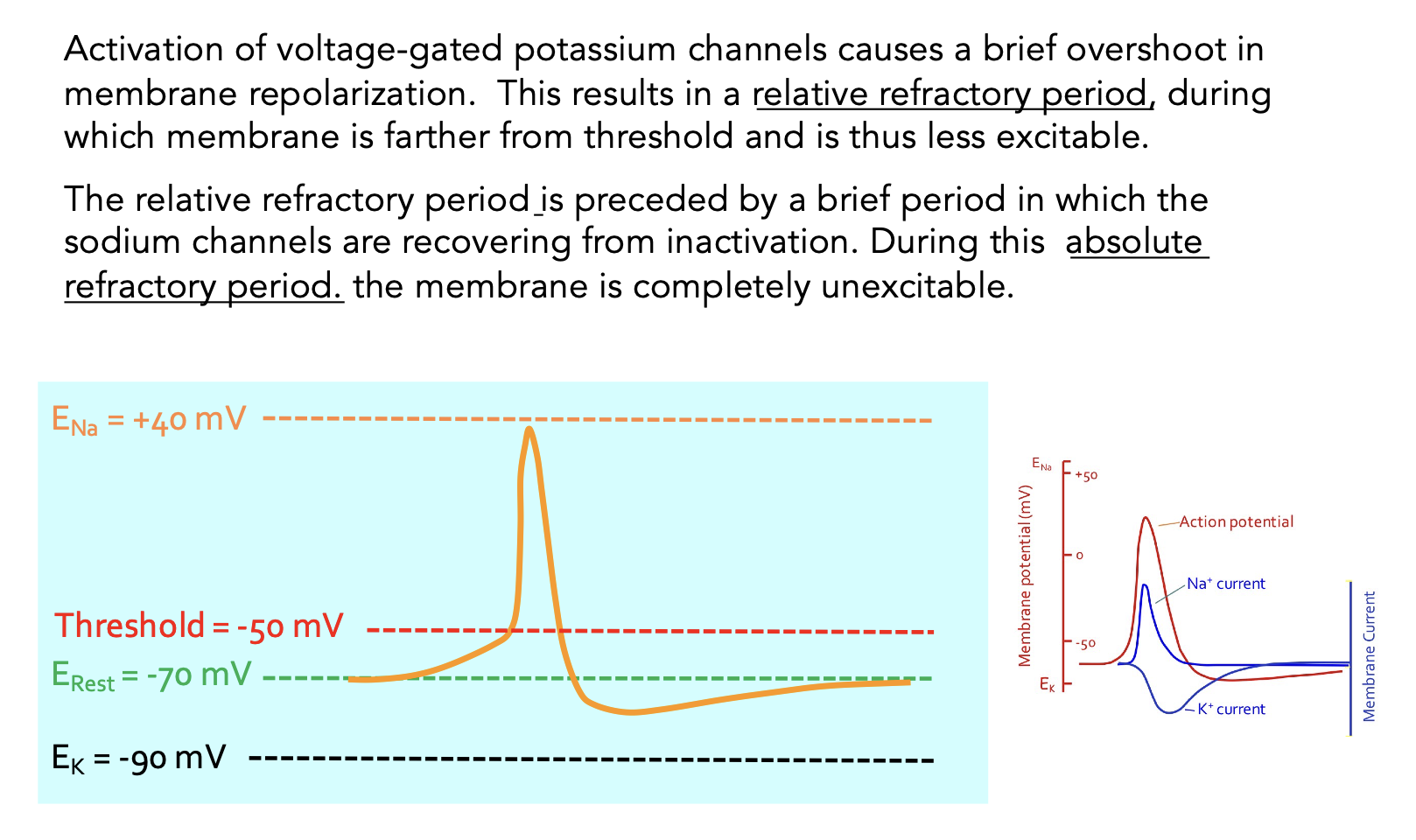 Refractory Periods are due to the inactivation properties of V-gated Na+ channels and the lag in K+ channel closing. While the Na+ channel is in an inactive state, it will not open in response to depolarization. This the absolute refractory period. After this period, there are enough Na+ channels in the closed (active) state to respond to depolarization. However, K+ channels that opened in response to repolarization are still open which keeps the membrane hyperpolarized. During this time, the membrane has a higher threshold for AP firing. This is the relative refractory period