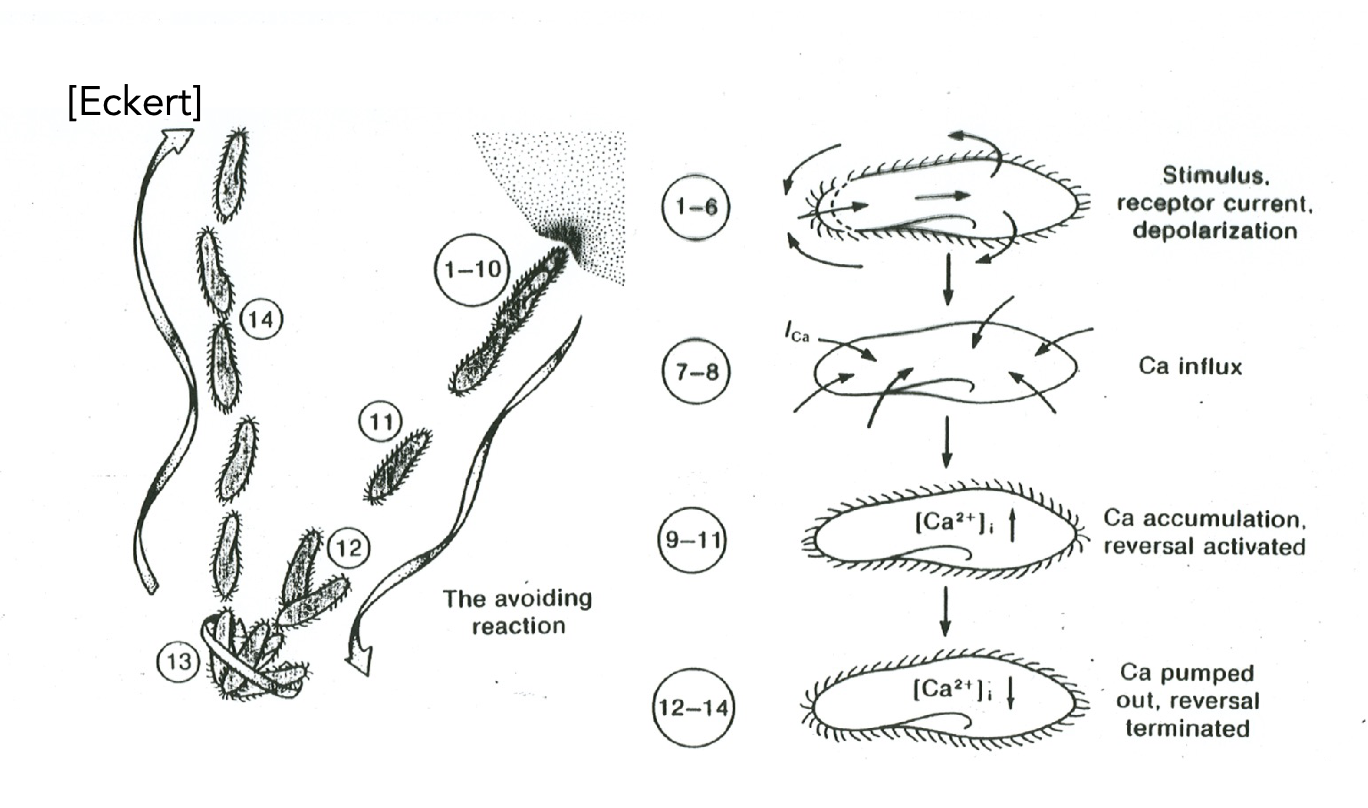 when the paracmecium runs into something, Ca+ channels open and Ca+ comes in, leading to reversal in the stroke of the cilia, so the paramecium swim in the opposite direction. until the Ca+ is pumped back out, to its original level, then the paramecium continue to swim in the forward direction