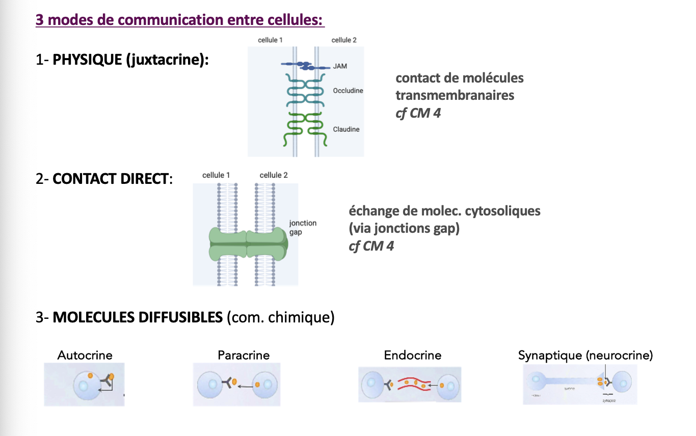 Quels sont les 3 modes de communication entre cellules ? Les schématiser.