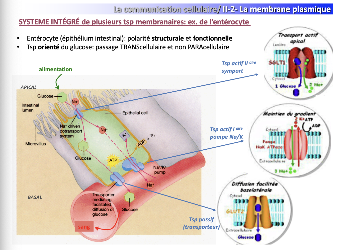 Côté apical (vers la lumière intestinale) : symport Na⁺/glucose (transport actif secondaire).