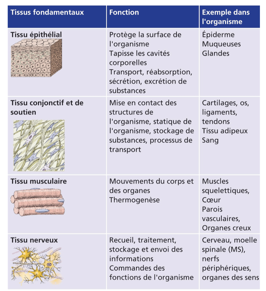 On distingue 4 grandes familles de tissus :