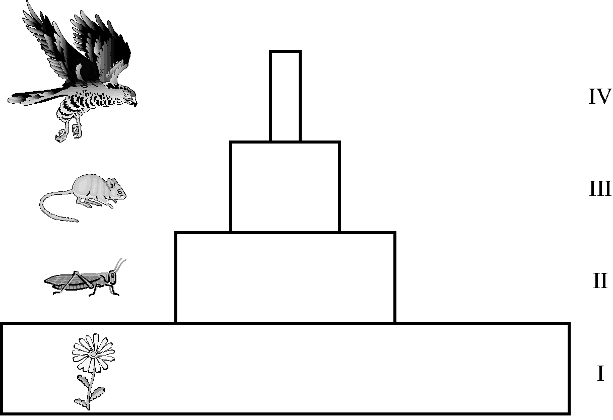 Assume there are 50,000 joules (J) of energy available in trophic level II in the figure. According to the conventional model of energy flow in ecosystems, which of the following statements correctly describes the flow of energy in the system?