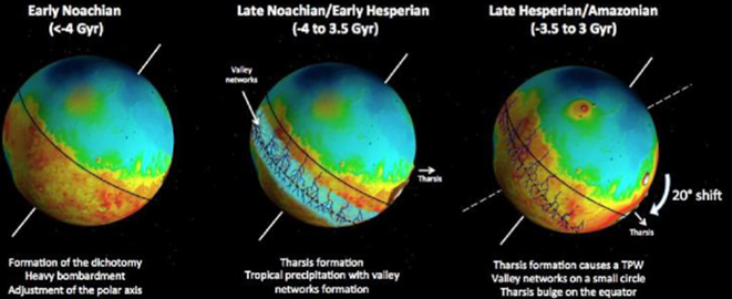 tharsis used to be in North - so much volcanism that it has driven mars to rotate on its axes and move tharsis towards the equator