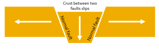 crust stretched, faulted noamrlly, valley floor drops relative to surroundings