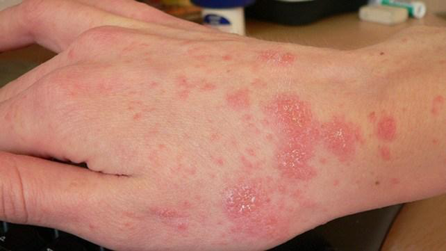 patches of skin become rough and inflamed, with blisters that cause itching and bleeding, sometimes resulting from a reaction to irritation