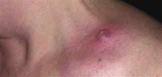 Red, swollen, may look like a boil with pus. Also skin rash or sore. Transmitted usually skin to skin.