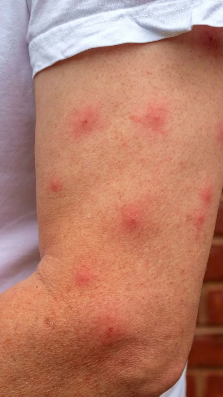 hives, generally caused by allergic immune response. Round and red, can cover small area or large.