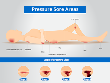 bed sores, from lying in one position too long so that the circulation in the skin is compromised by the pressure