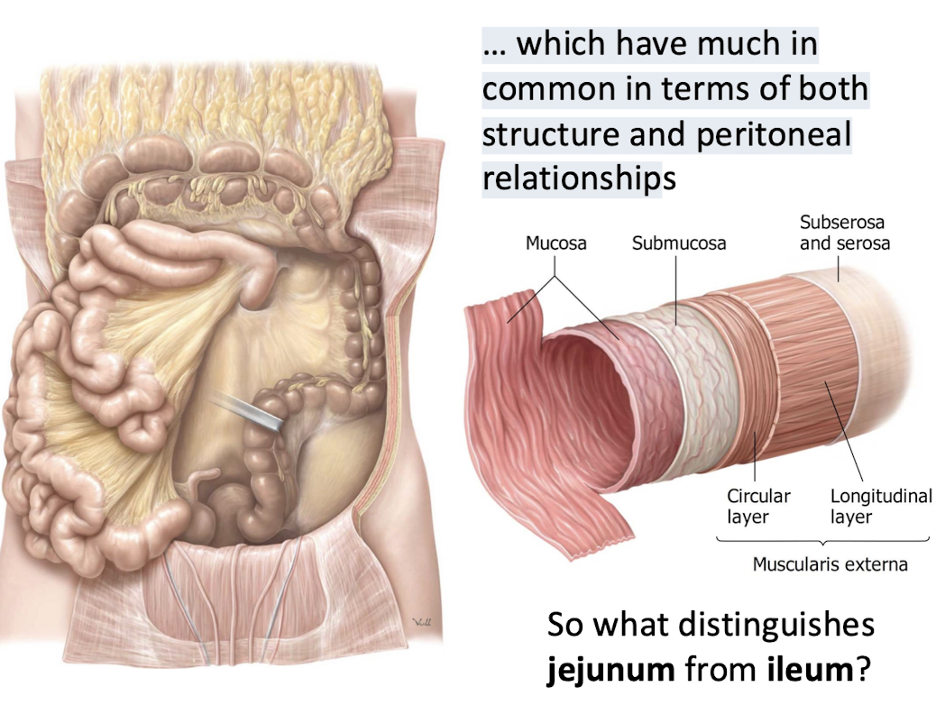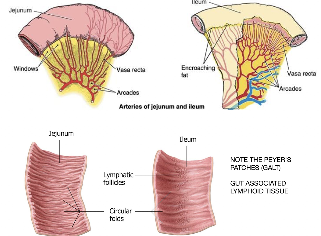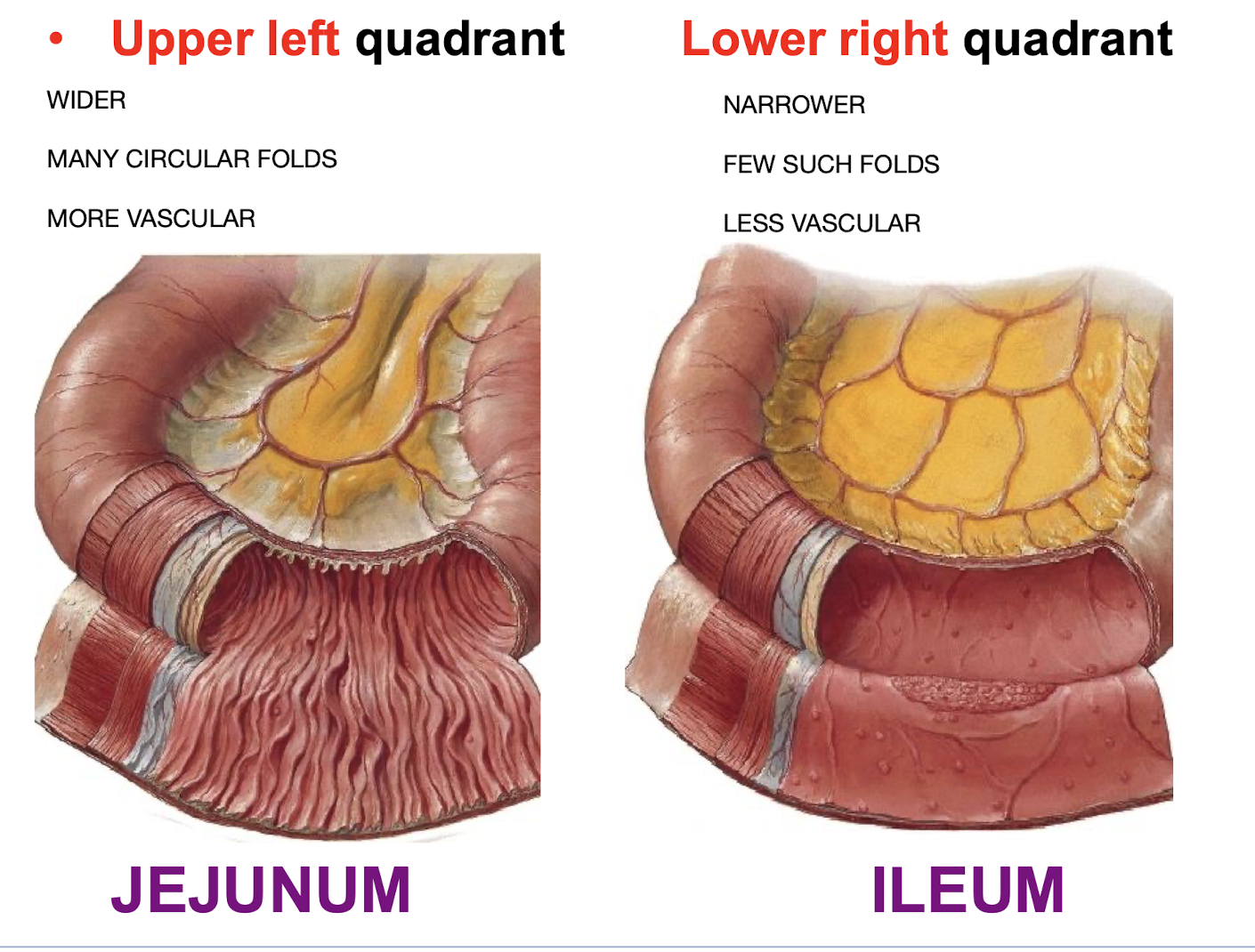 Compare and contrast the jejunum and Ileum. Including location in the abdomen, physical and internal architecture, and vasculature