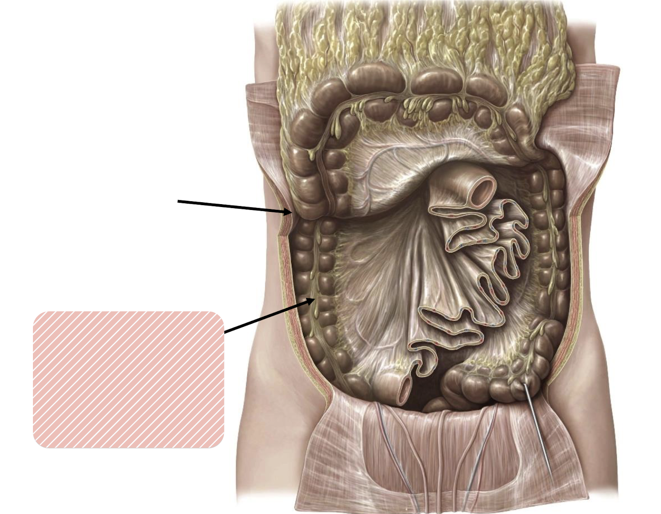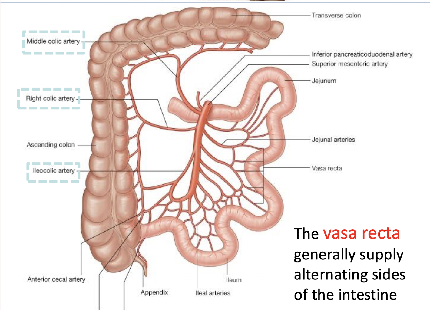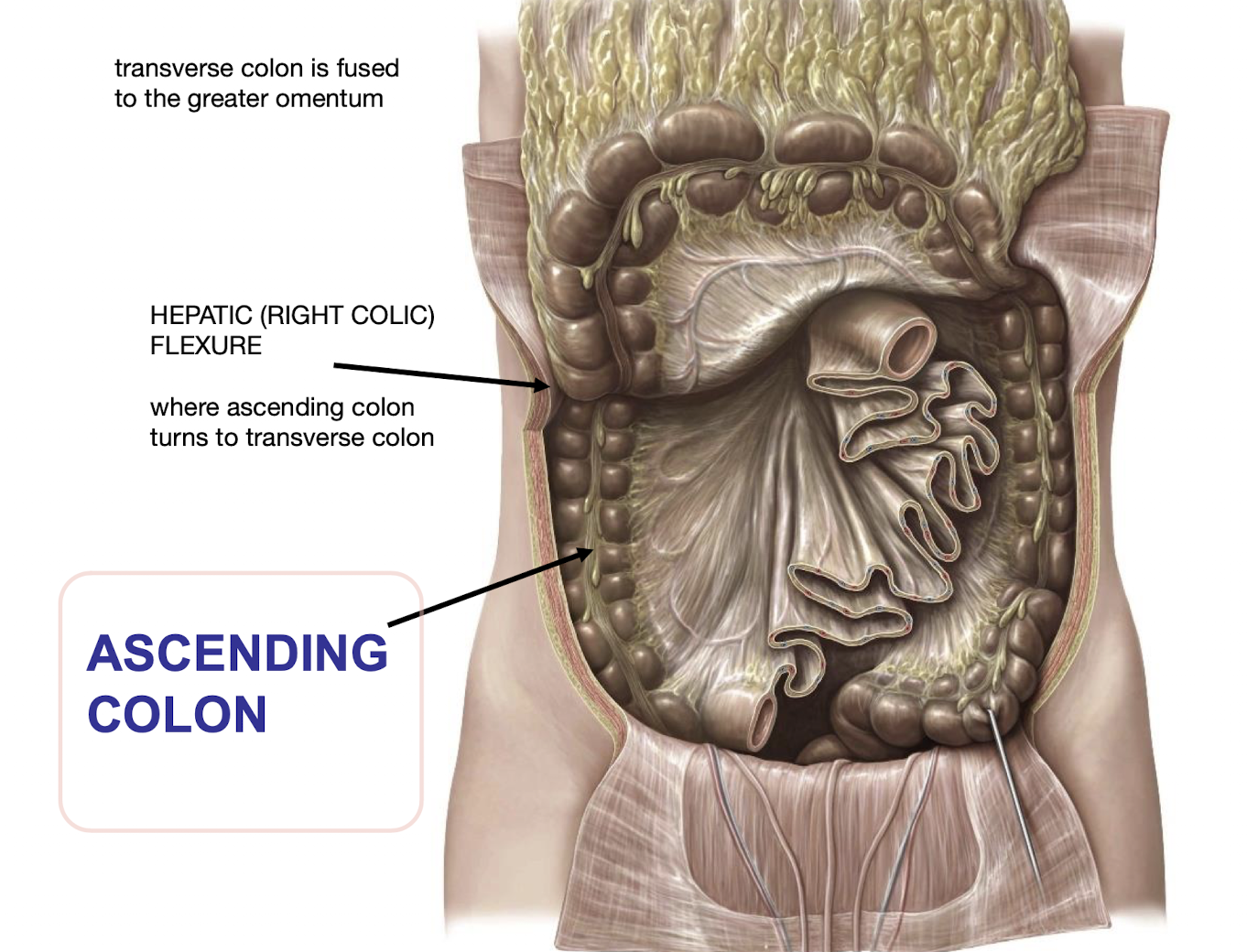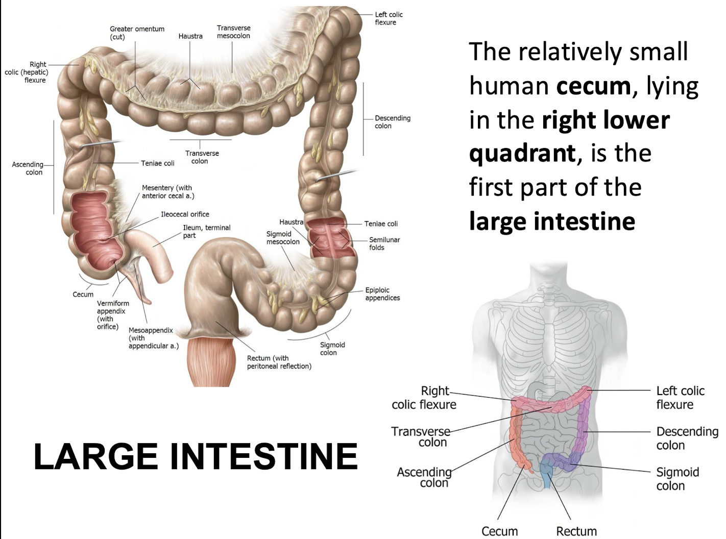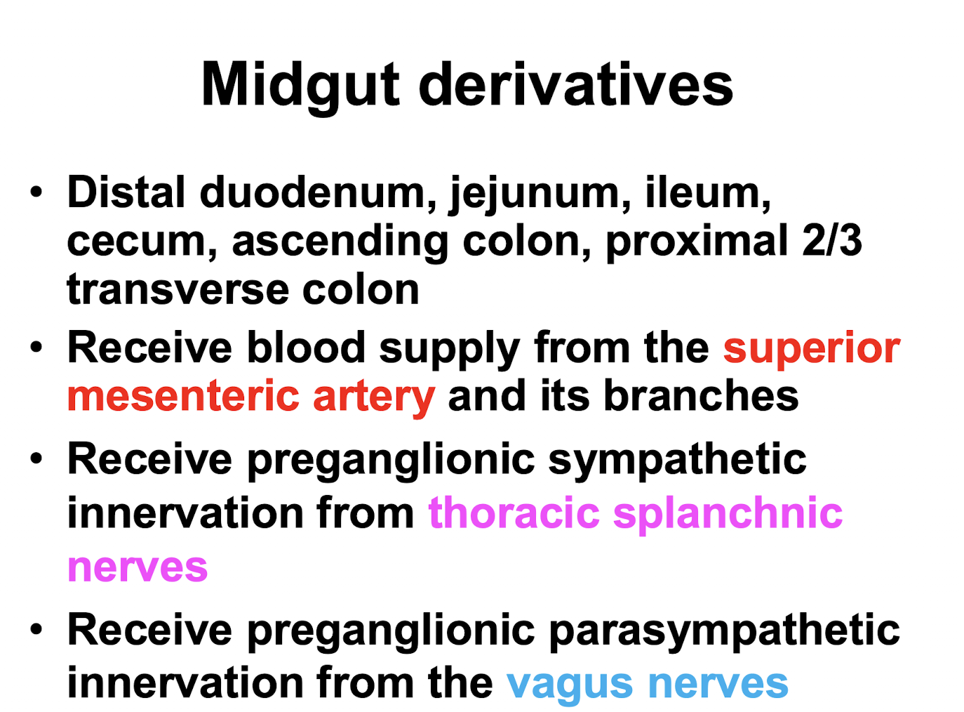 Distal duodenum; jejunum; ileum; cecum; ascending colon; proximal 2/3 transverse colon.