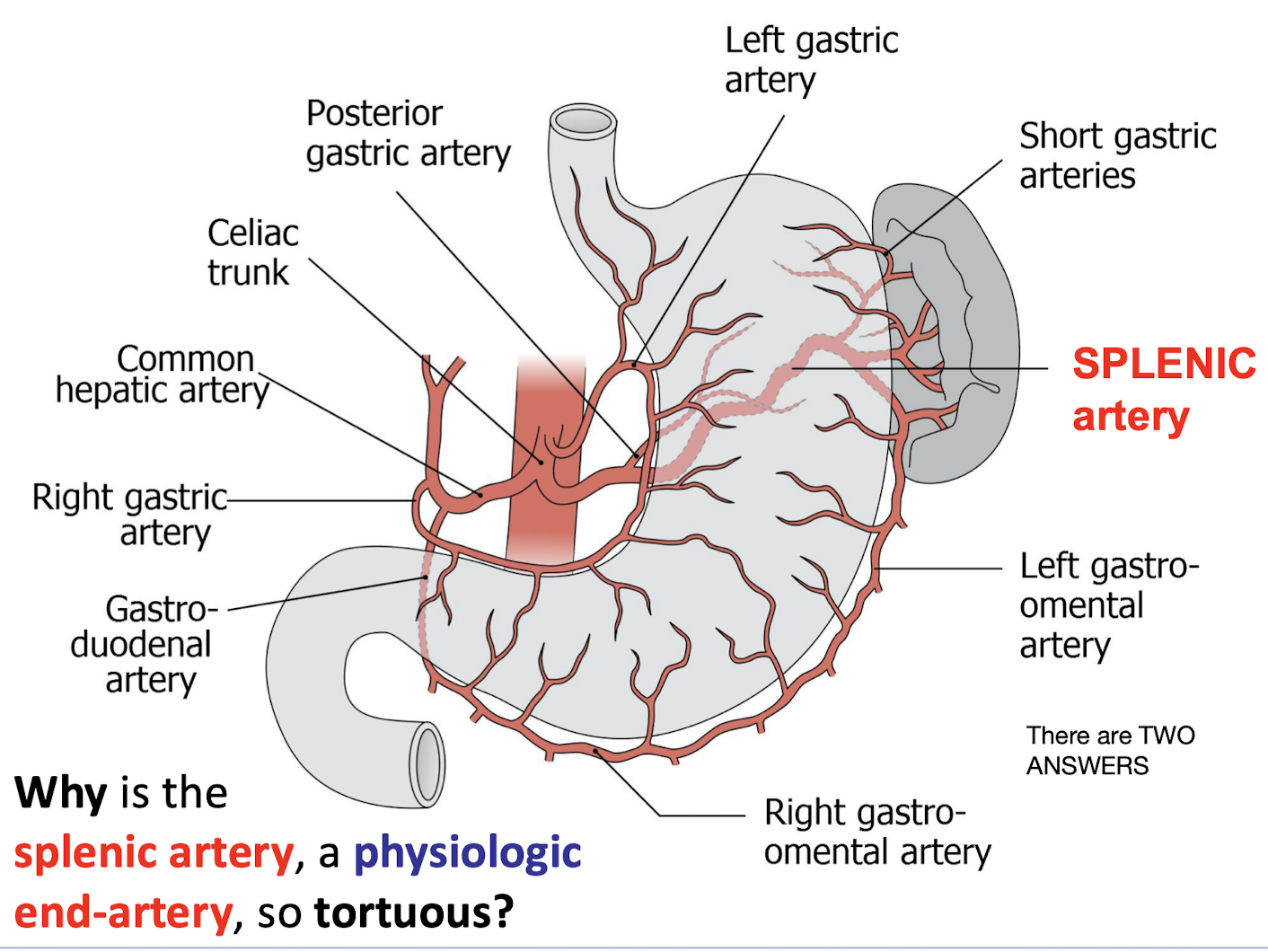 Why is the splenic artery, a physiologic end-artery, so tortuous?