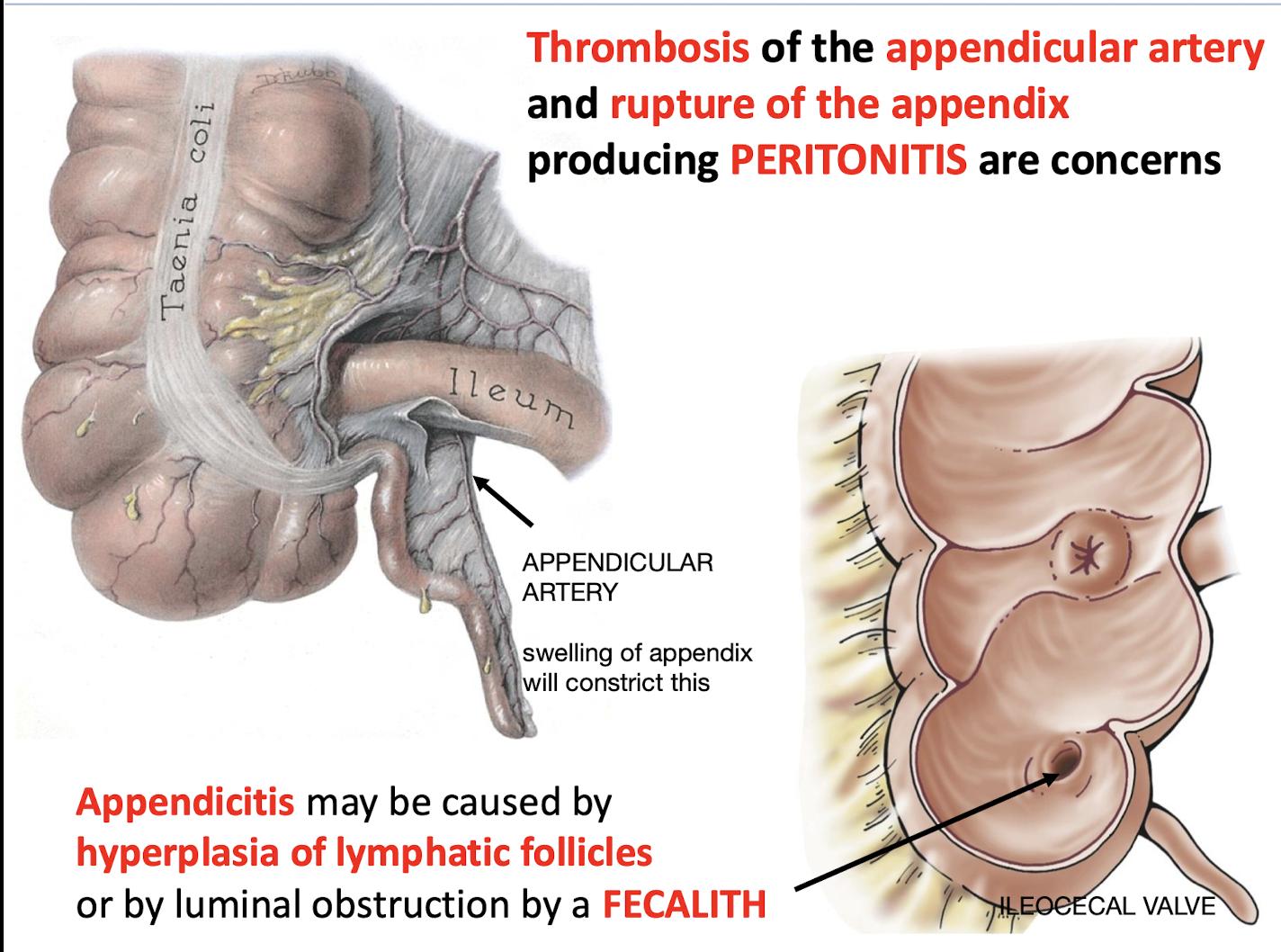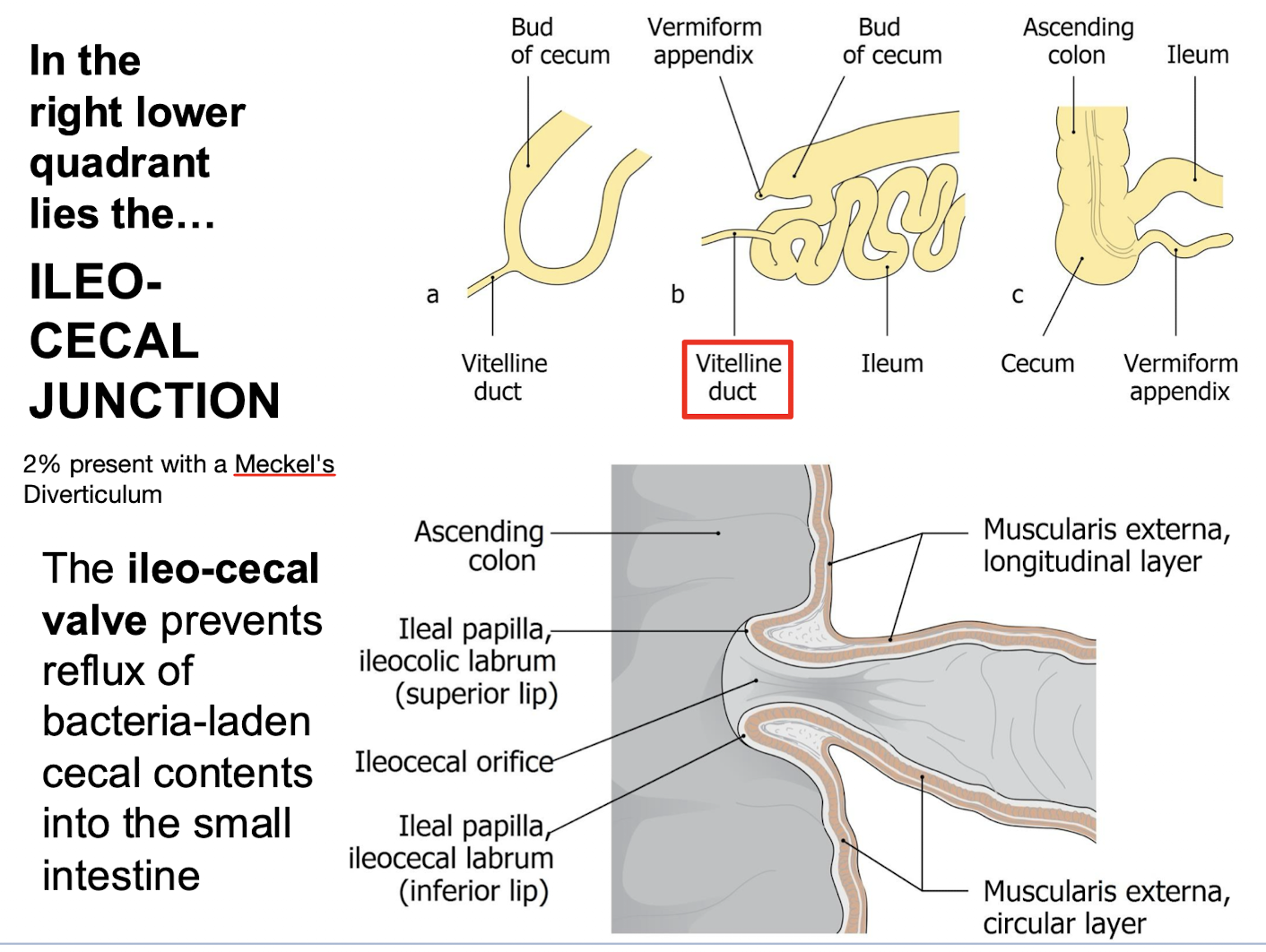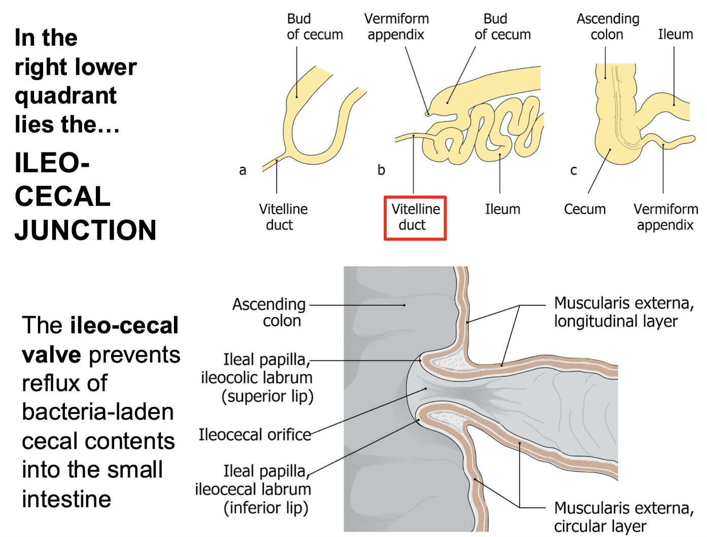 What structure lies in the right lower quadrant and what is a common congenital anomaly there