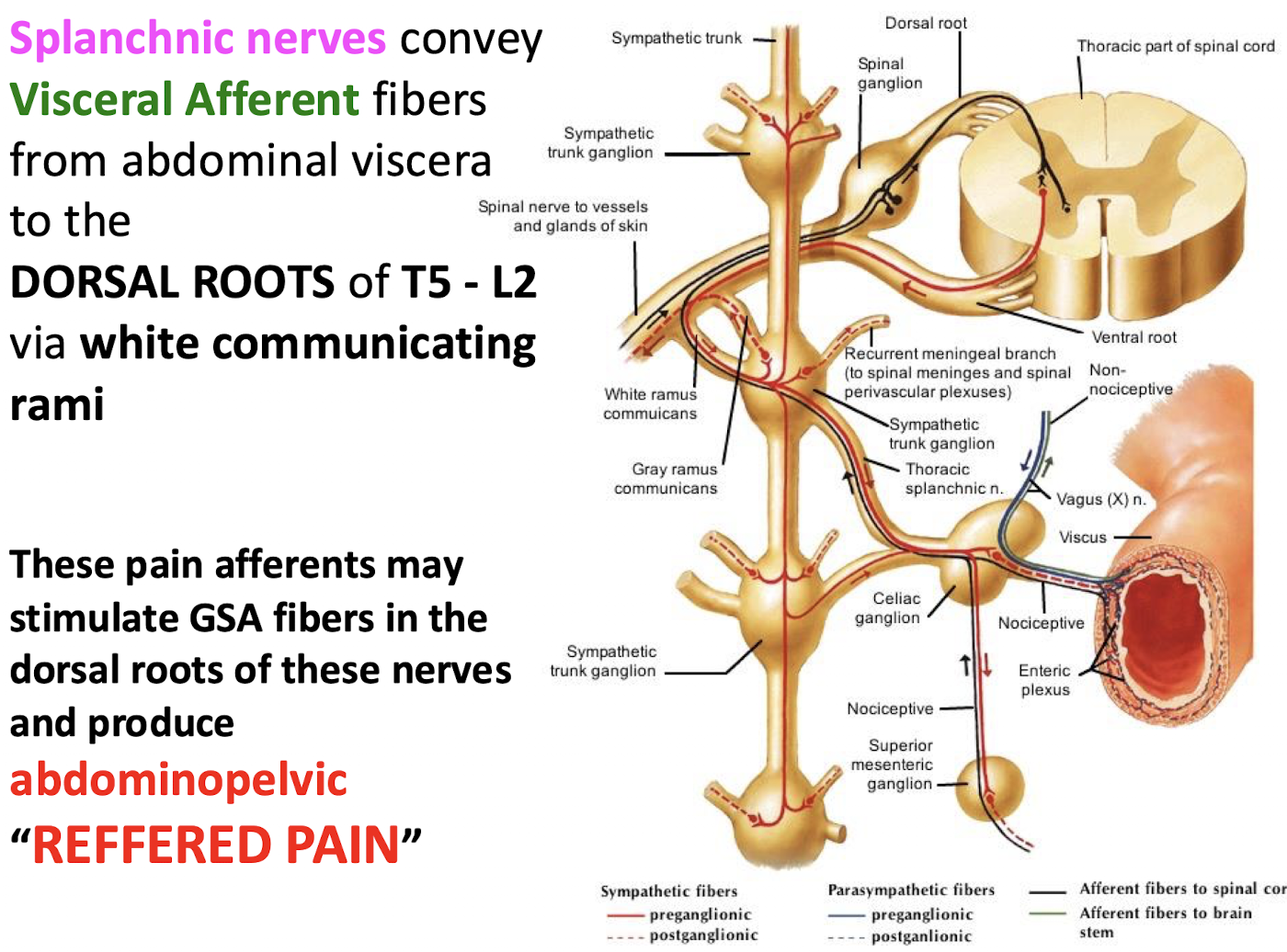 Visceral afferent (GVA) pain fibers stimulate General Somatic Afferent (GSA) fibers (from the body wall) that enter the same dorsal root level (T5–L2). The brain interprets the signal as coming from the more sensitive somatic (body wall) location.