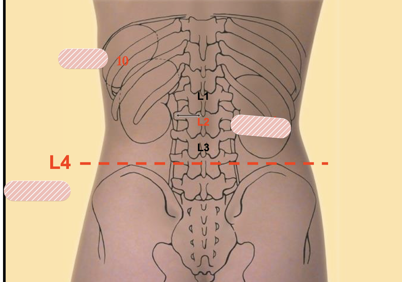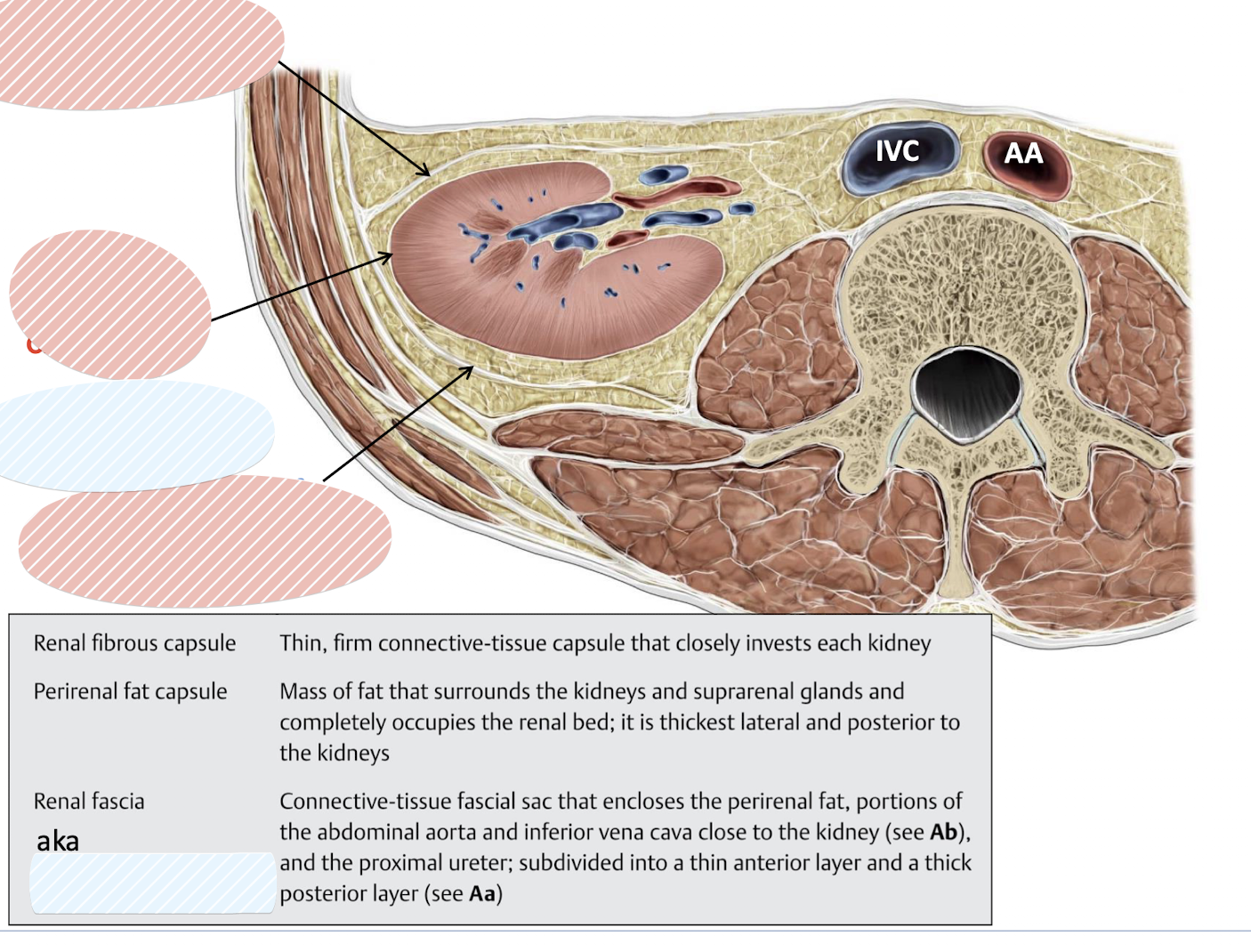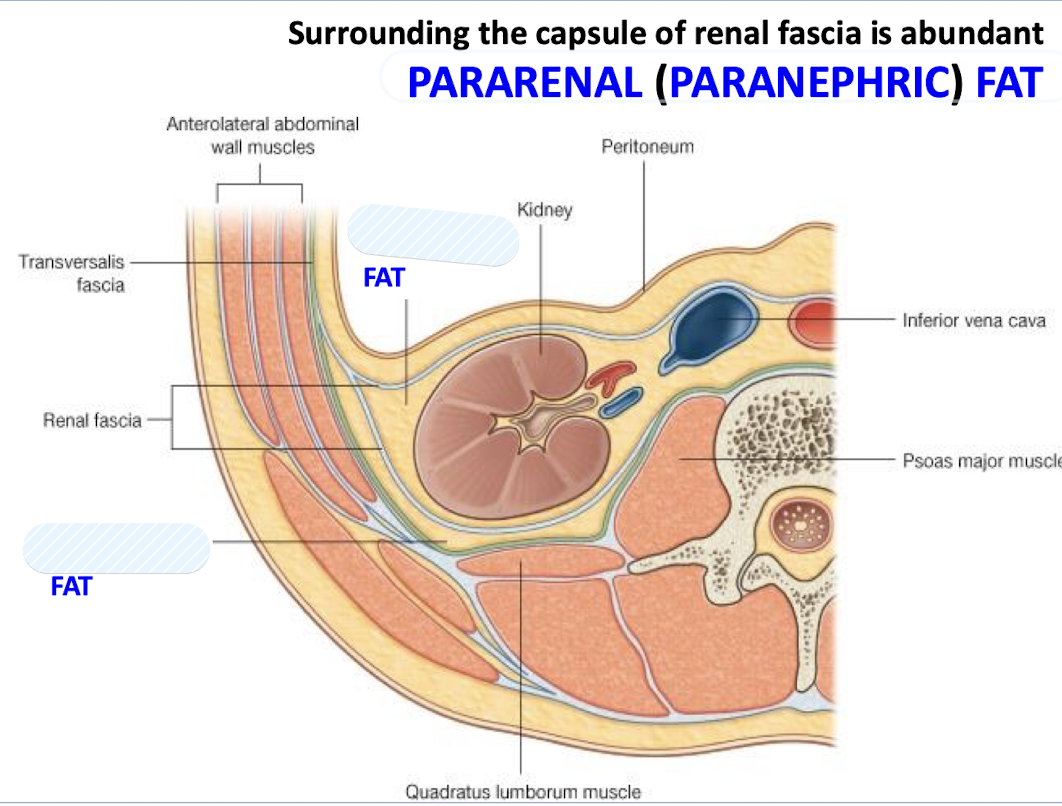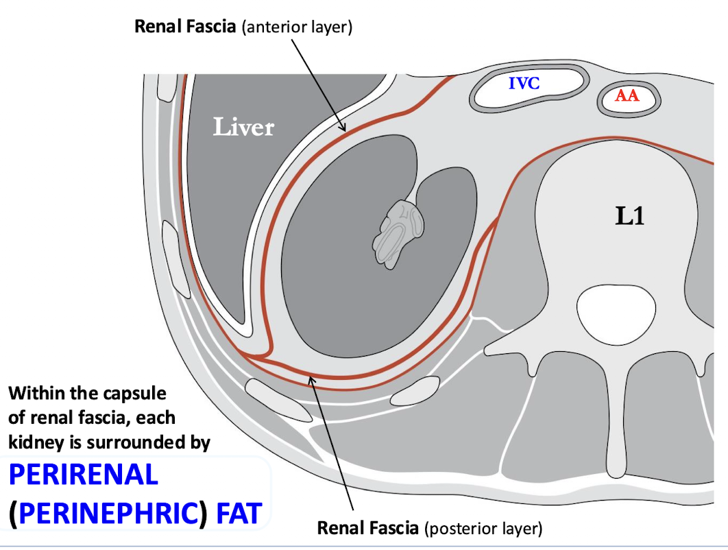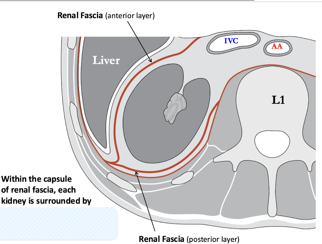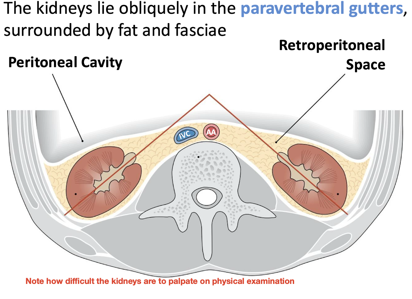 Obliquely in the paravertebral gutters; surrounded by fat and fasciae.