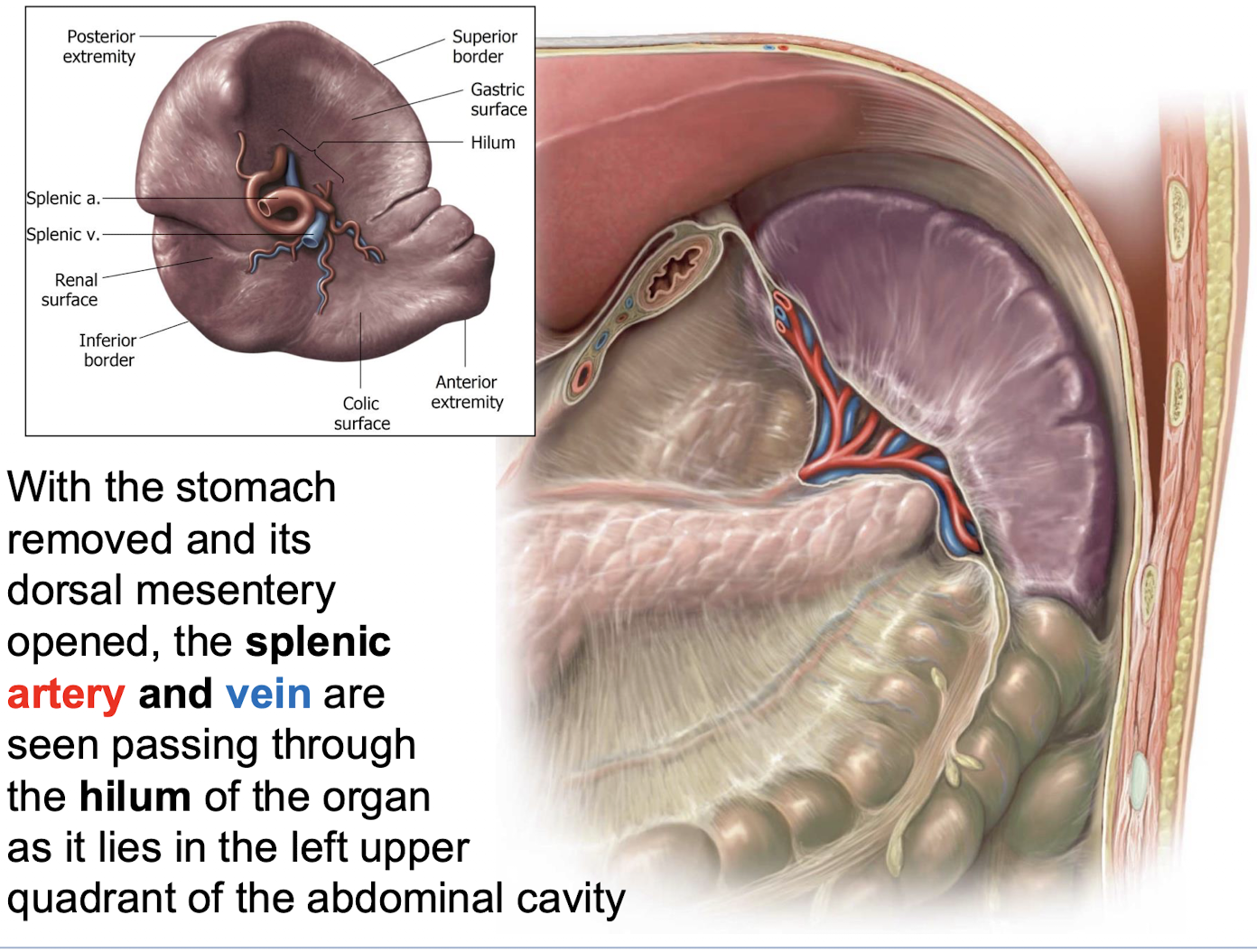 The splenic artery and vein through the spleen’s hilum as it lies in the left upper quadrant.