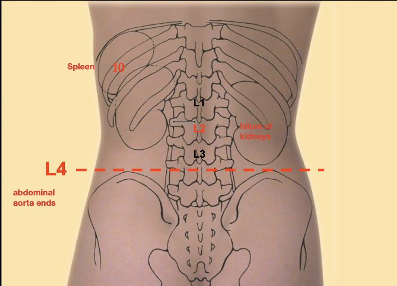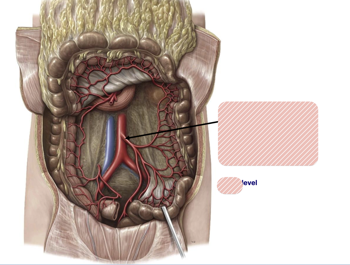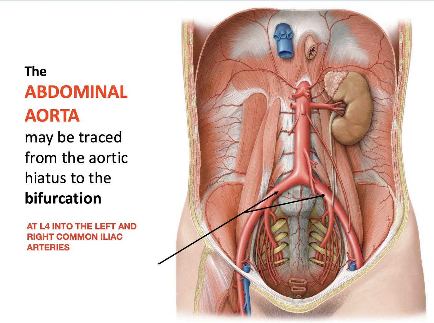 Ends at L4, where it bifurcates into left and right common iliac arteries